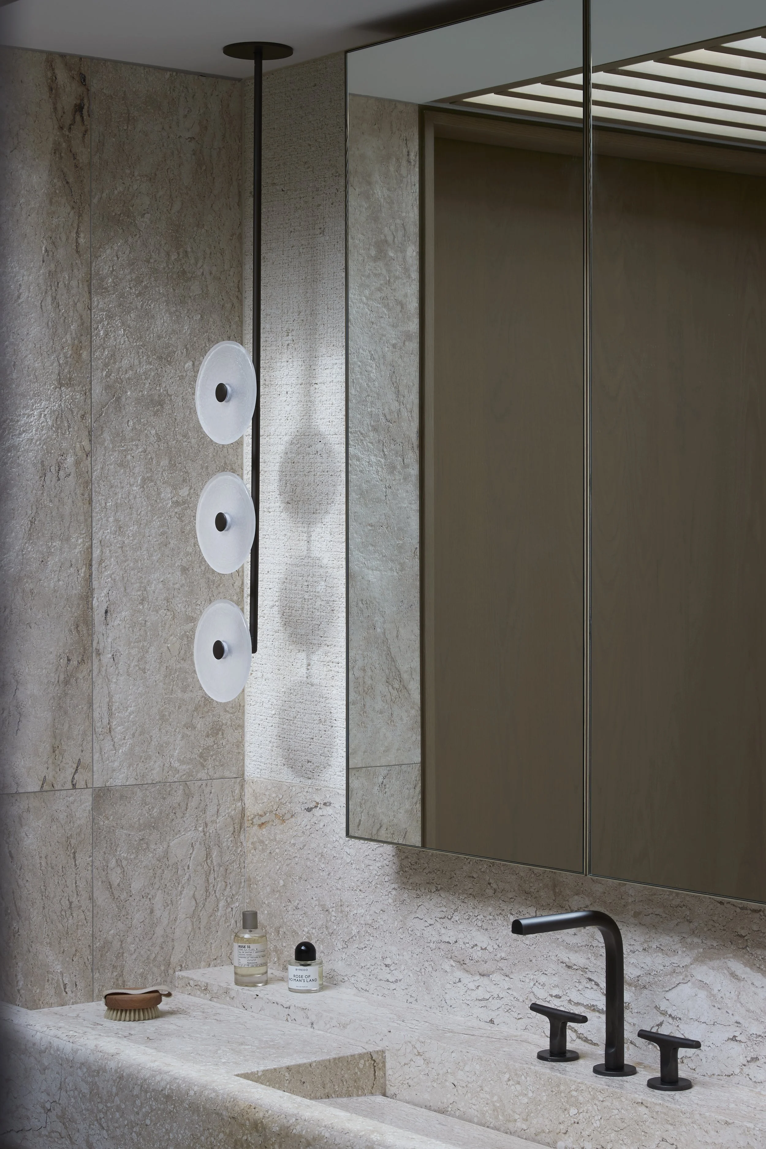A central narrative guided the design: water sculpting form over time. Travertine, reminiscent of handmade soap, inspired surfaces and transitions that appear smoothed and shaped by water’s touch.